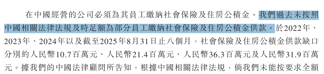 招股书明确承认:“公司未能完全按照相关法律和法规为部分员工缴纳社会保险和住房公积金。”2022年至2025年前8个月,社保和公积金缴费缺口合计超亿元,且缺口规模呈扩大趋势,该问题早在A股上市期间就已被监管关注,至今仍未彻底解决,构成公司核心合规风险。