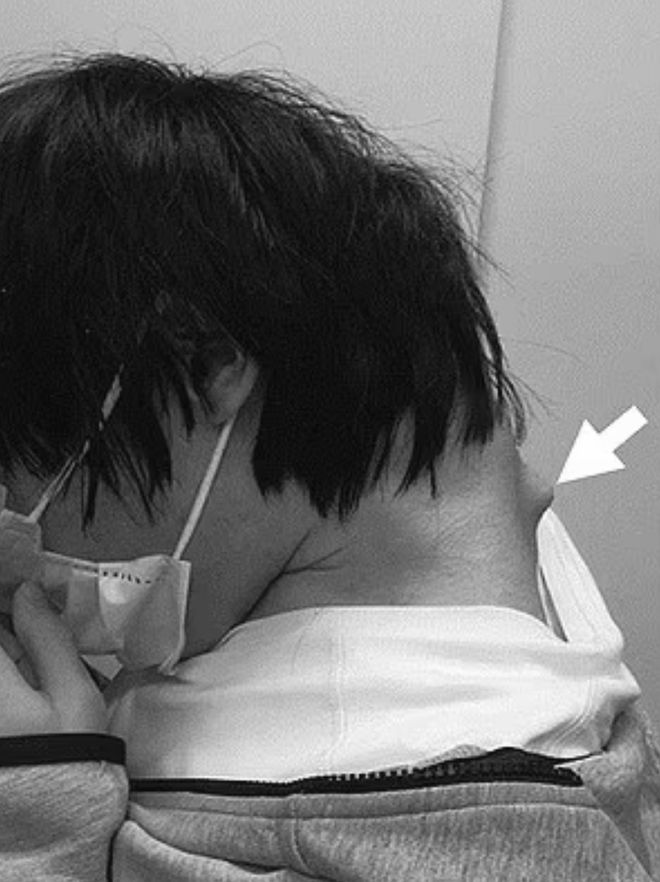 据悉,患者为一名25岁男子,患者家属同意医生公布其具体患病细节,以警示更多人。照片显示,患者的后颈部出现了一个非常尖锐的肿块,医生认为这是由于他的椎骨因不自然的位置而“极度伸展”造成的。