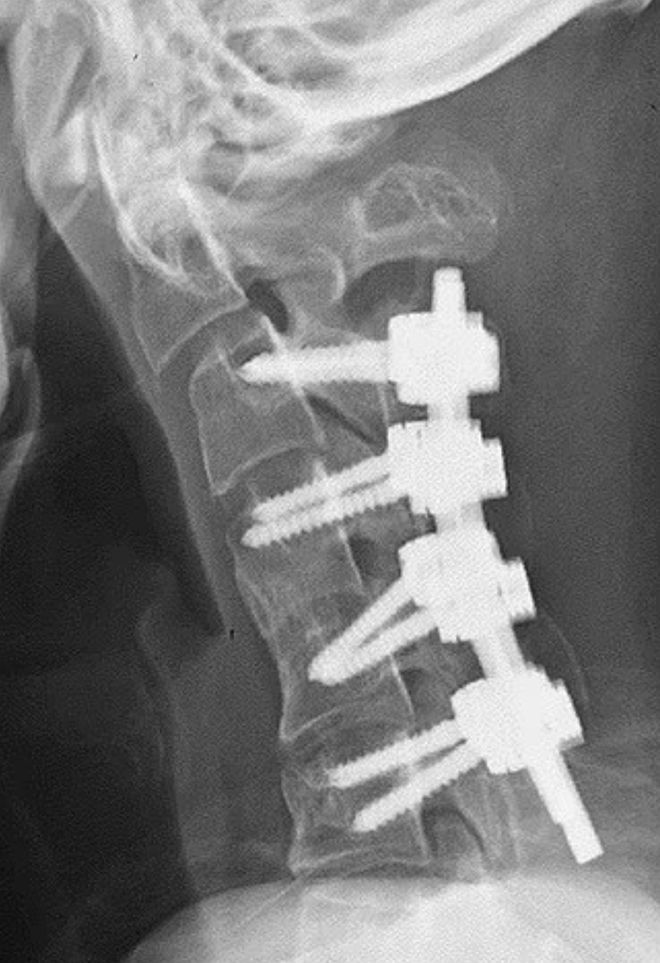 医护人员最初尝试用颈圈来纠正该患者的“下垂头综合征”,但由于其反映佩戴设备时感到麻木,因此停止了这种治疗。医生后来选择了一系列外科手术,首先切除了患者的小段椎骨和颈部的一些疤痕状组织,然后将一系列螺钉和金属棒插入他的颈骨以矫正姿势。